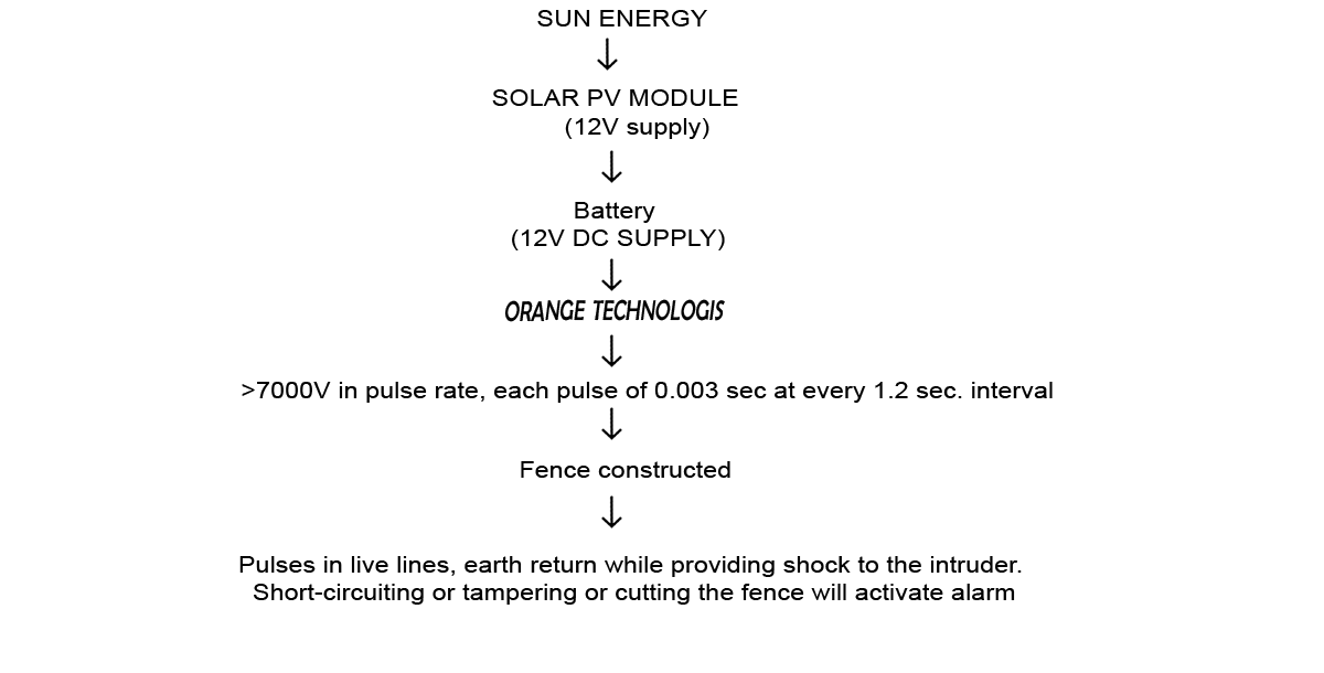 Solar Photovoltaic Modules converts Light Energy into electricity and stores in a 12V Battery. From Battery 12V supply flows to the Orange Technologies SSS500 Unit, which is the heart of the Fencing System. The Orange Technologies 500 Unit energizes the 12V supply in to very high voltage i.e., about 7000V on load, and sends through the typically constructed fence in pulse rate. Duration of each pulse is 0.003 sec at the interval of 1.2 sec each. These pulses are very sharp and protect your area by giving the intruder a SHARP SHORT BUT SAFE SHOCK that will be registered in the memory and Creates psychological fear.